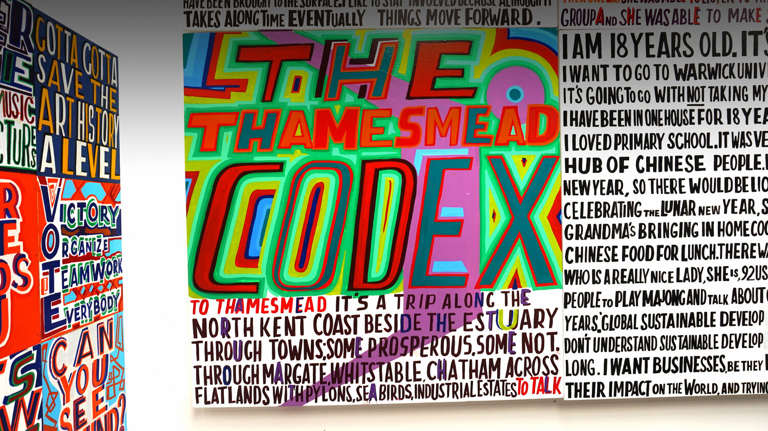 THAMESMEAD CODEX THAMESMEAD CODEX - Illuminate Productions THAMESMEAD CODEX By artist Bob and Roberta Smith 24-metre long artwork that celebrates the words of Thamesmead residents. A collaboration between Peabody and Tate Modern. Produced by Illuminate Productions. Bob and Roberta Smith Thamesmead Codex 2021 collection of the artist. © tommophoto.com Bob and Roberta Smith Thamesmead Codex 2021 collection of the artist. © tommophoto.com Bob and Roberta Smith Thamesmead Codex 2021 collection of the artist. © tommophoto.com Bob and Roberta Smith Thamesmead Codex 2021 collection of the artist. © tommophoto.com Bob and Roberta Smith Thamesmead Codex 2021 collection of the artist. © tommophoto.com